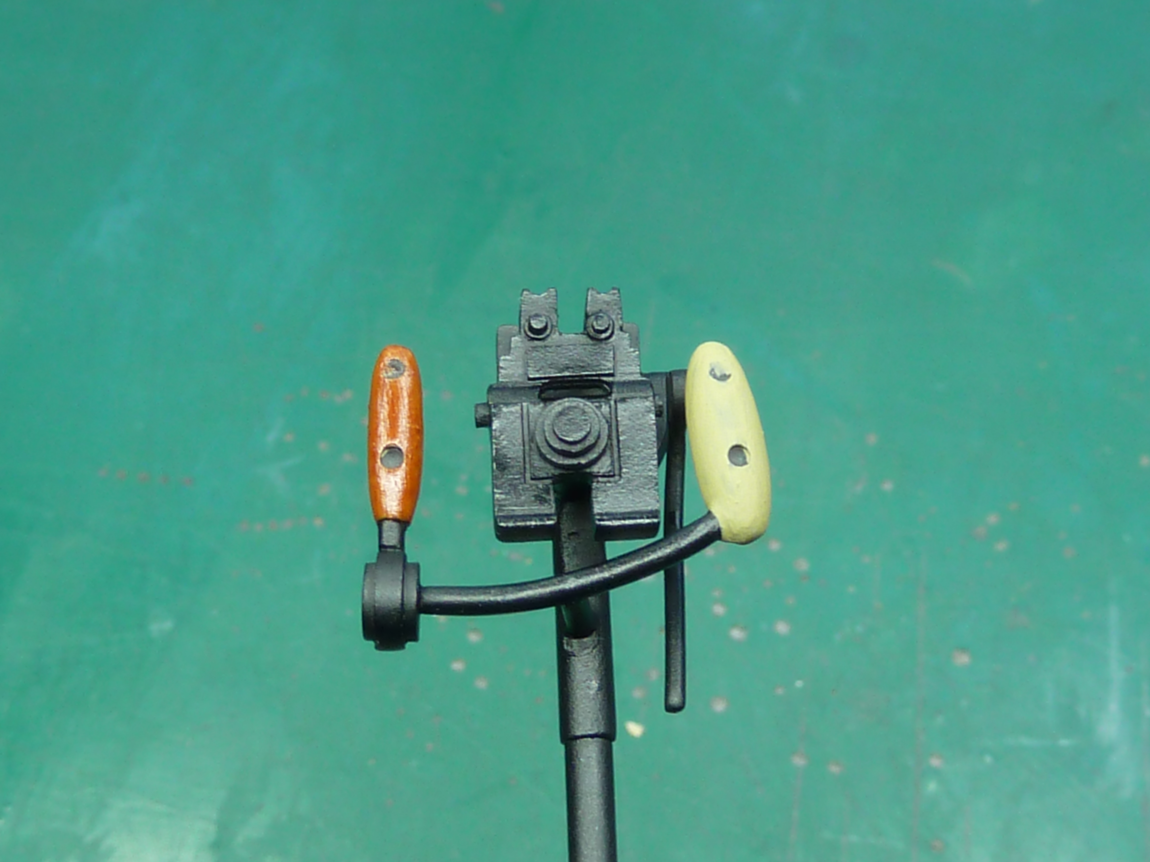 The only detailing done was painting the column grips with artist’s oils to simulate the wood. The one on the right below is in the base colour. The one on the left has had the oils applied. The screws were eventually painted silver once the oils were dry.
