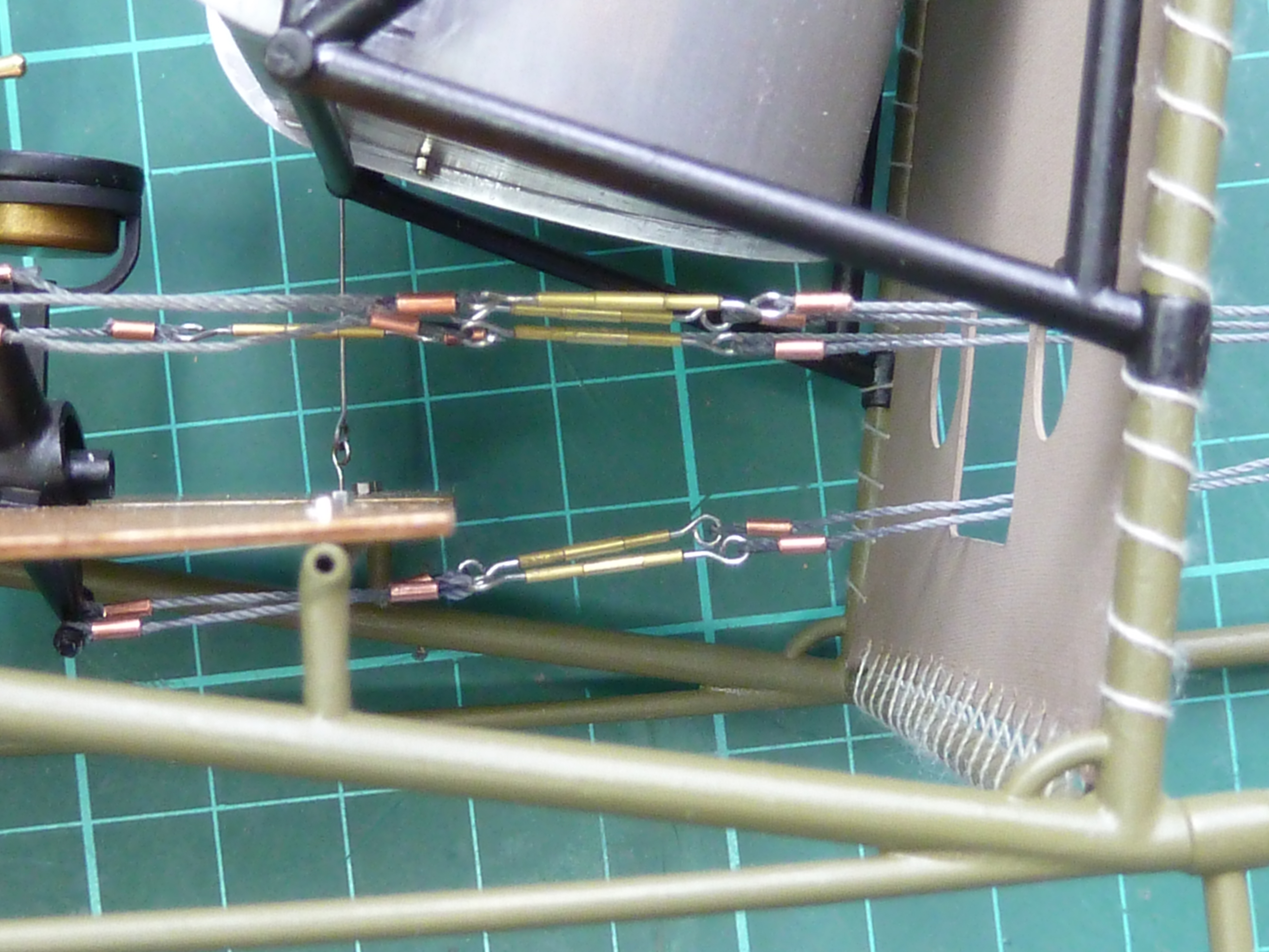 To make the actual turnbuckles the mounting loops are glued into the 0.8 mm OD brass tube with CA glue. The revised turnbuckles are still not completely there, but they’re better than the Camels.