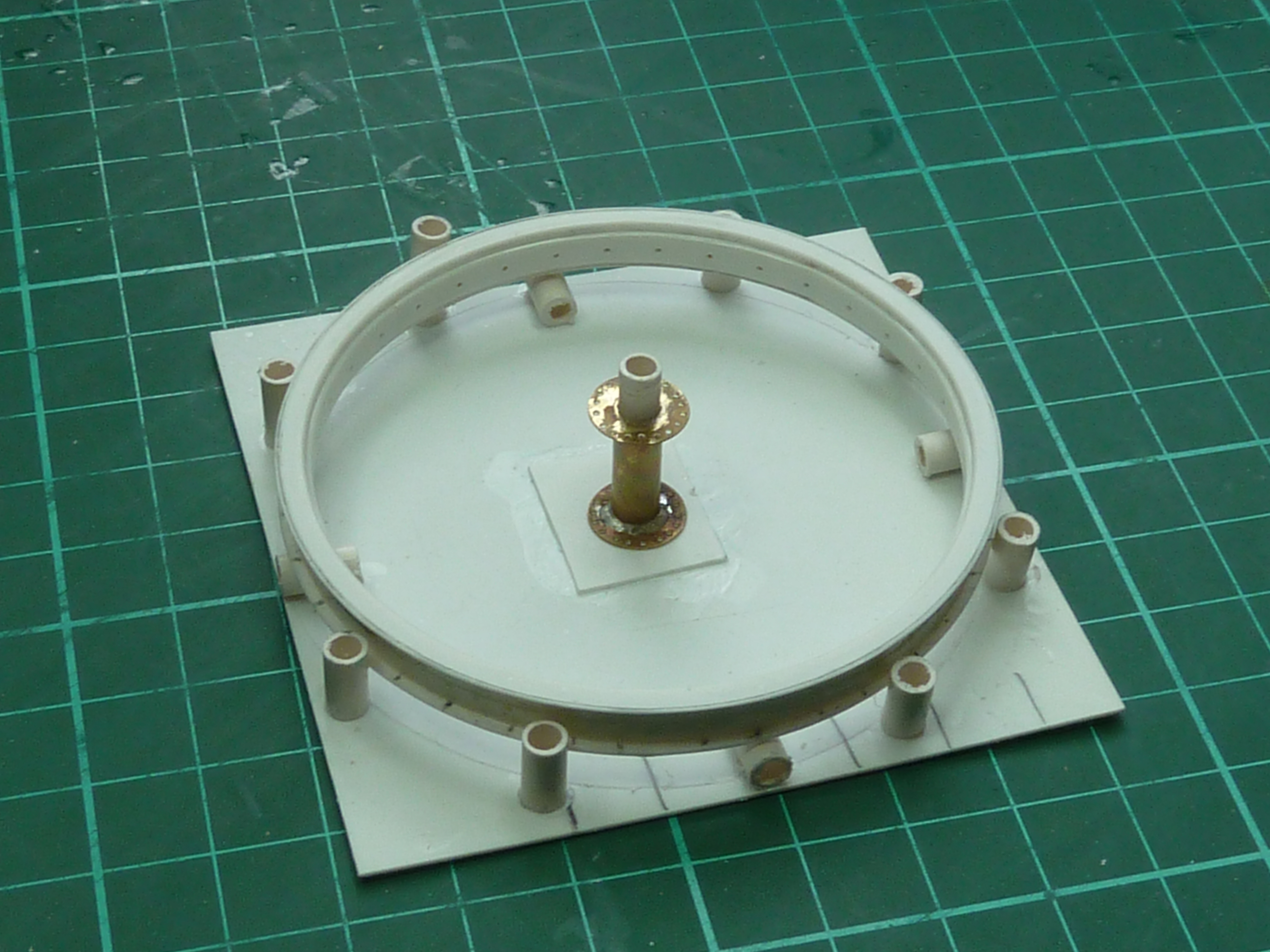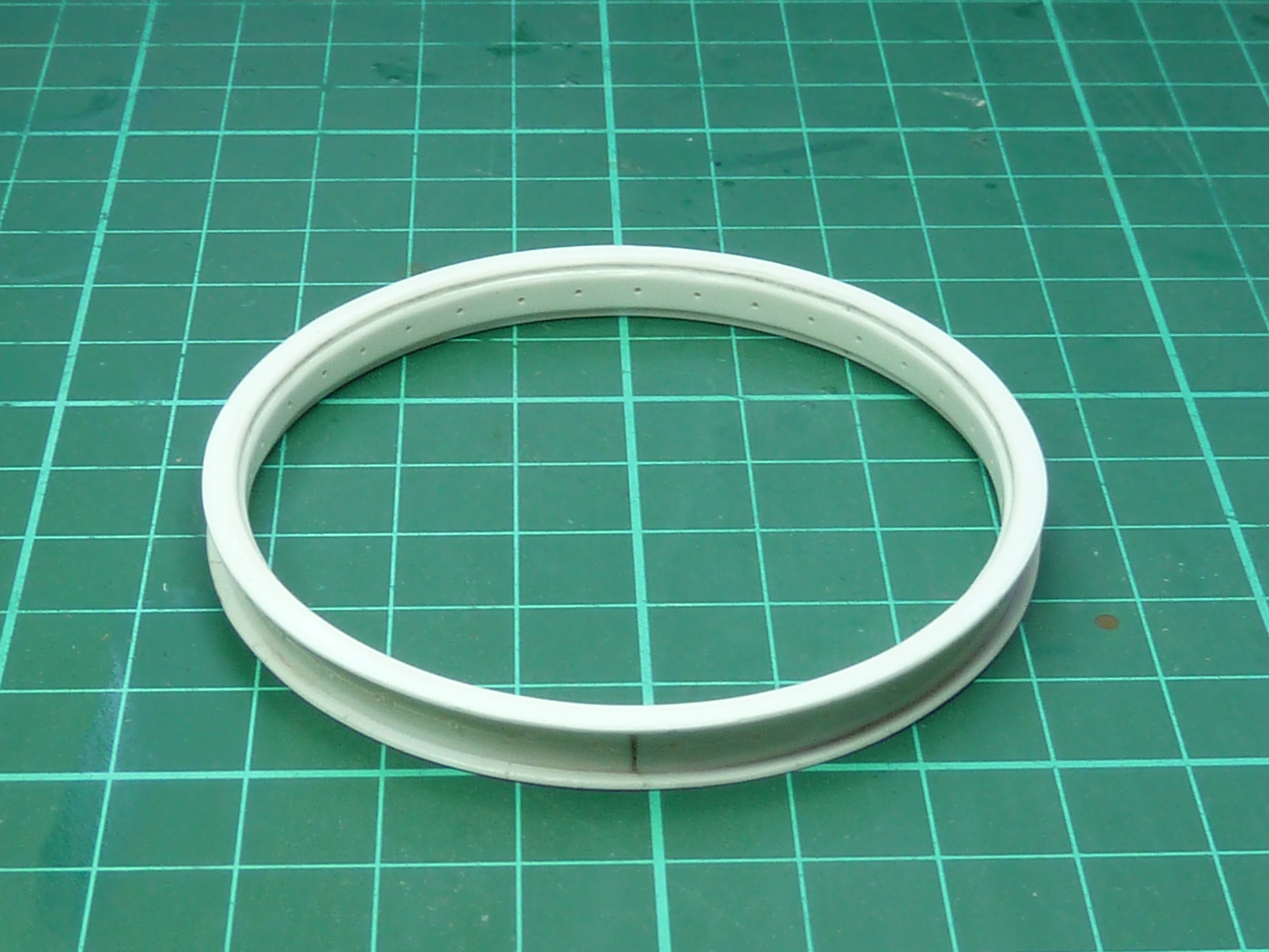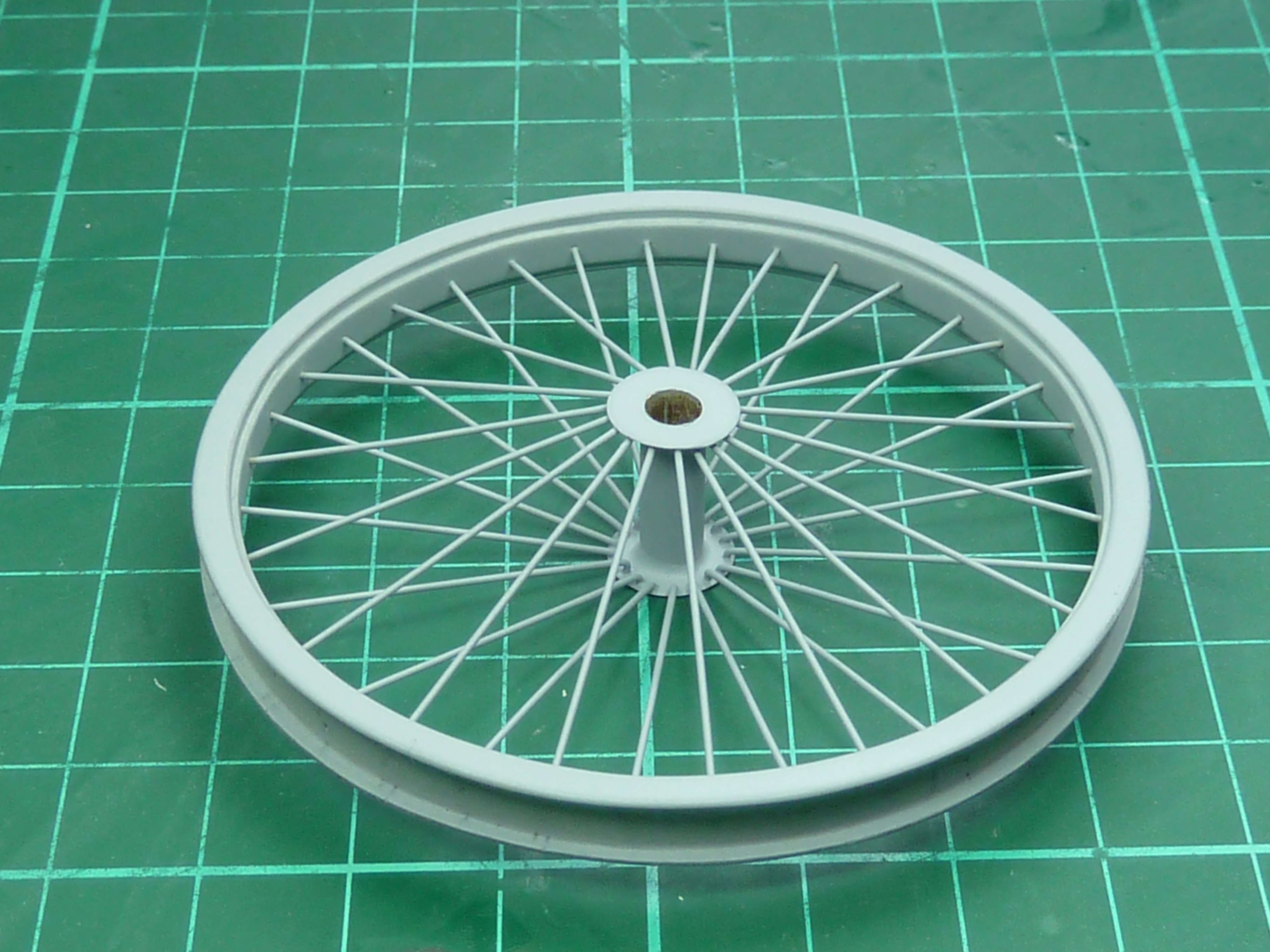 The construction of the spoked wheel followed the same principles as that used on the Camel. Laminations of plasticard (30 thou) strip were glued around a former to make the basic rim and two discs of plasticard glued on to form the edges of the rim.