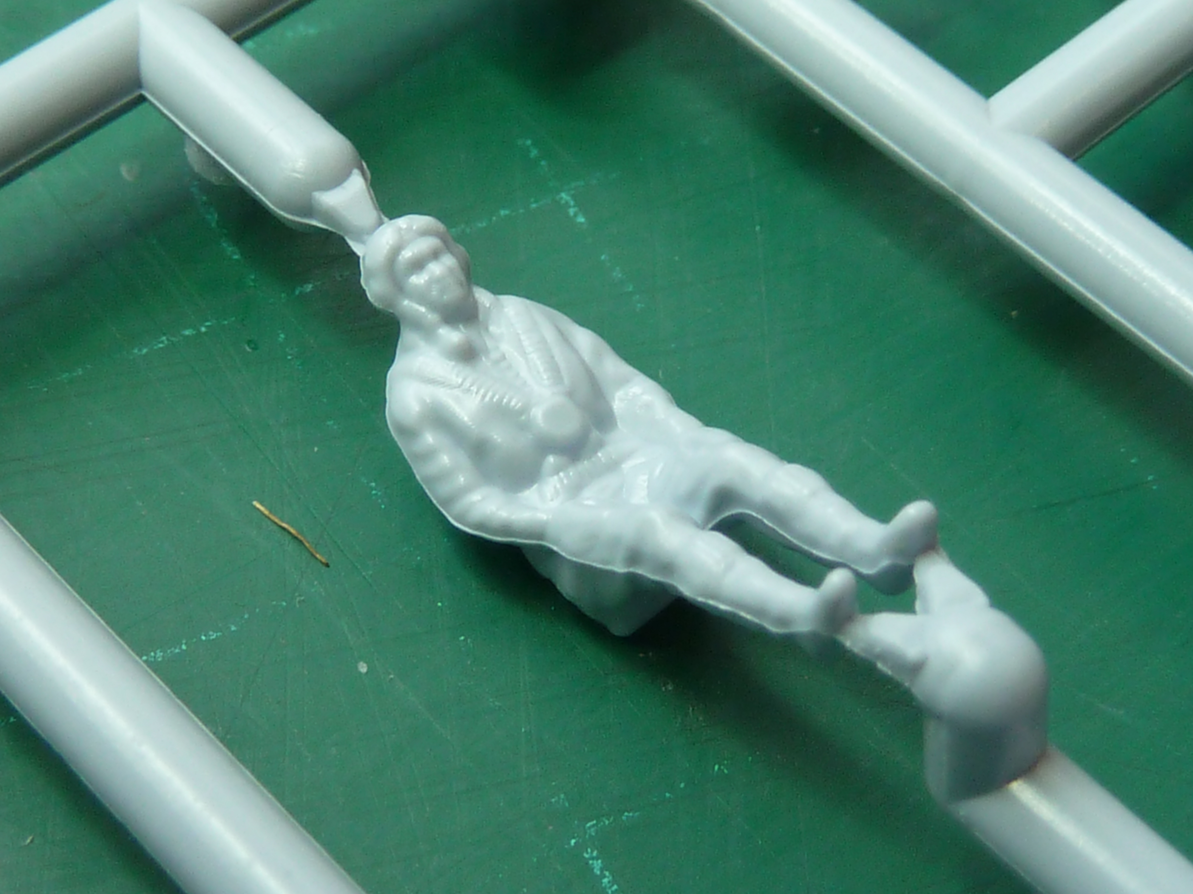 The pilot was parted from his moulded on stand and mounted on some 0.5 mm brass rod, then cleaned up using a very sharp scalpel and 3000 grit emery paper.