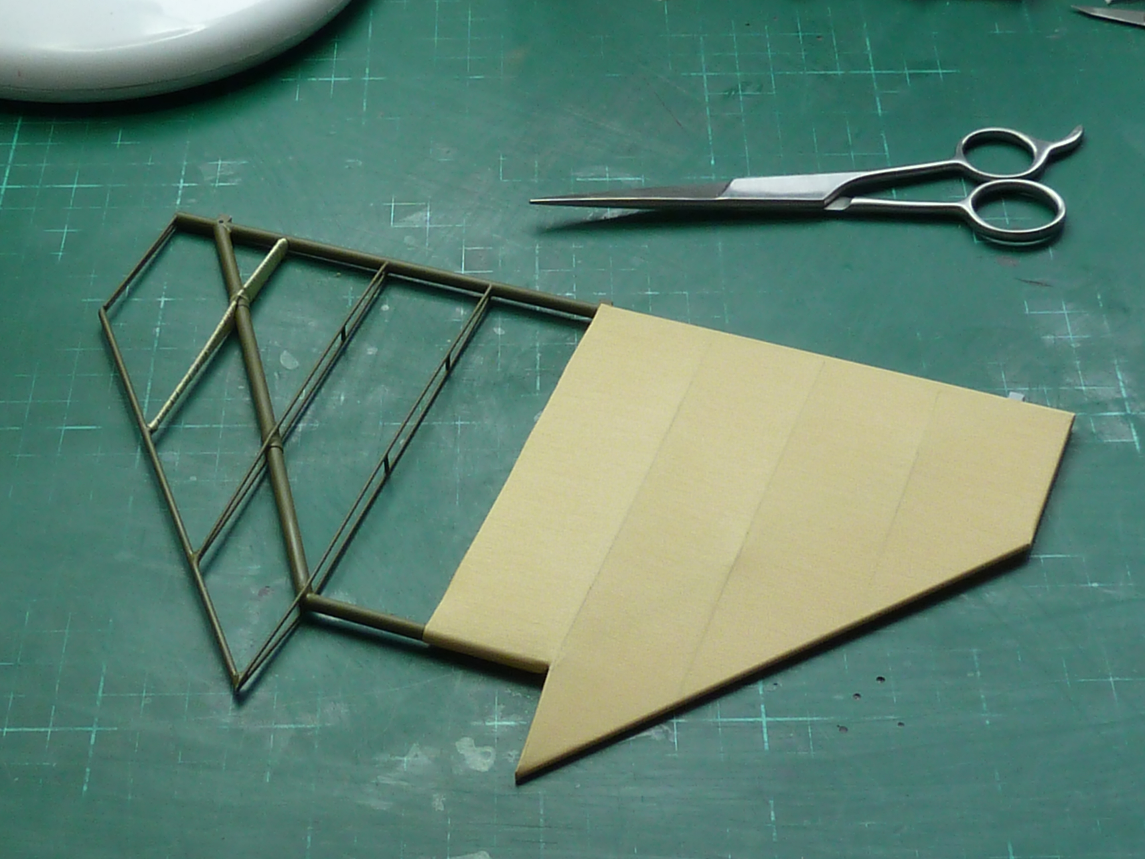 which I was quite pleased with. As before, the structure got a coat of etch primer, the uncovered side was sprayed green and given a thin coat of acrylic varnish. The other side was covered in Solartex which went without a hitch this time.