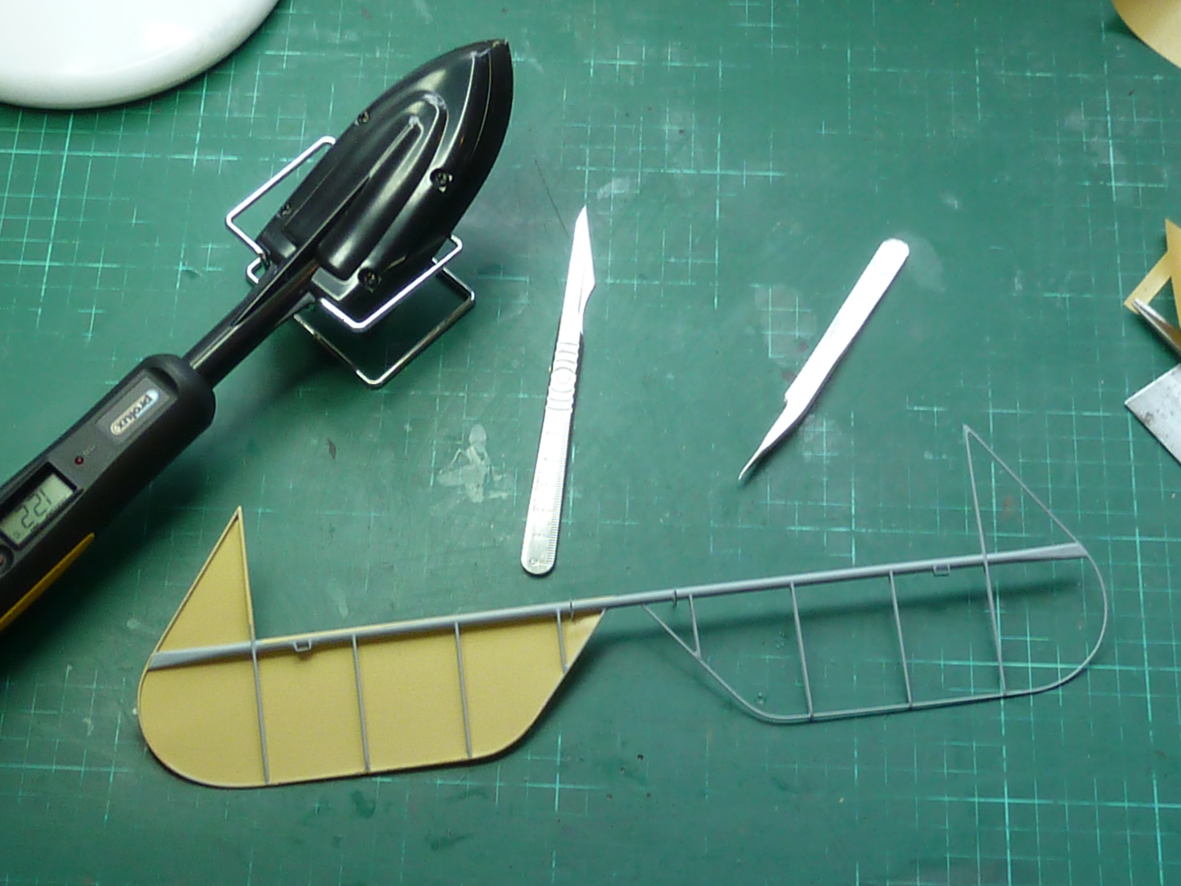 I knew this might be a problem as the heat shoe needs to be set at around 120°C to melt the Solartex glue and a little more than that to properly shrink the material. Not a problem on the Camel’s wooden and metal parts, but dancing close to the edge on the ABS plastic which deforms at around these temperatures. However, I thought that if I didn’t linger with the heat shoe I might get away with it.
