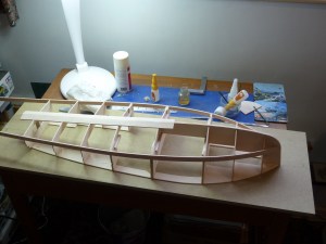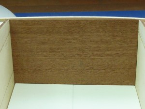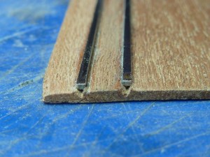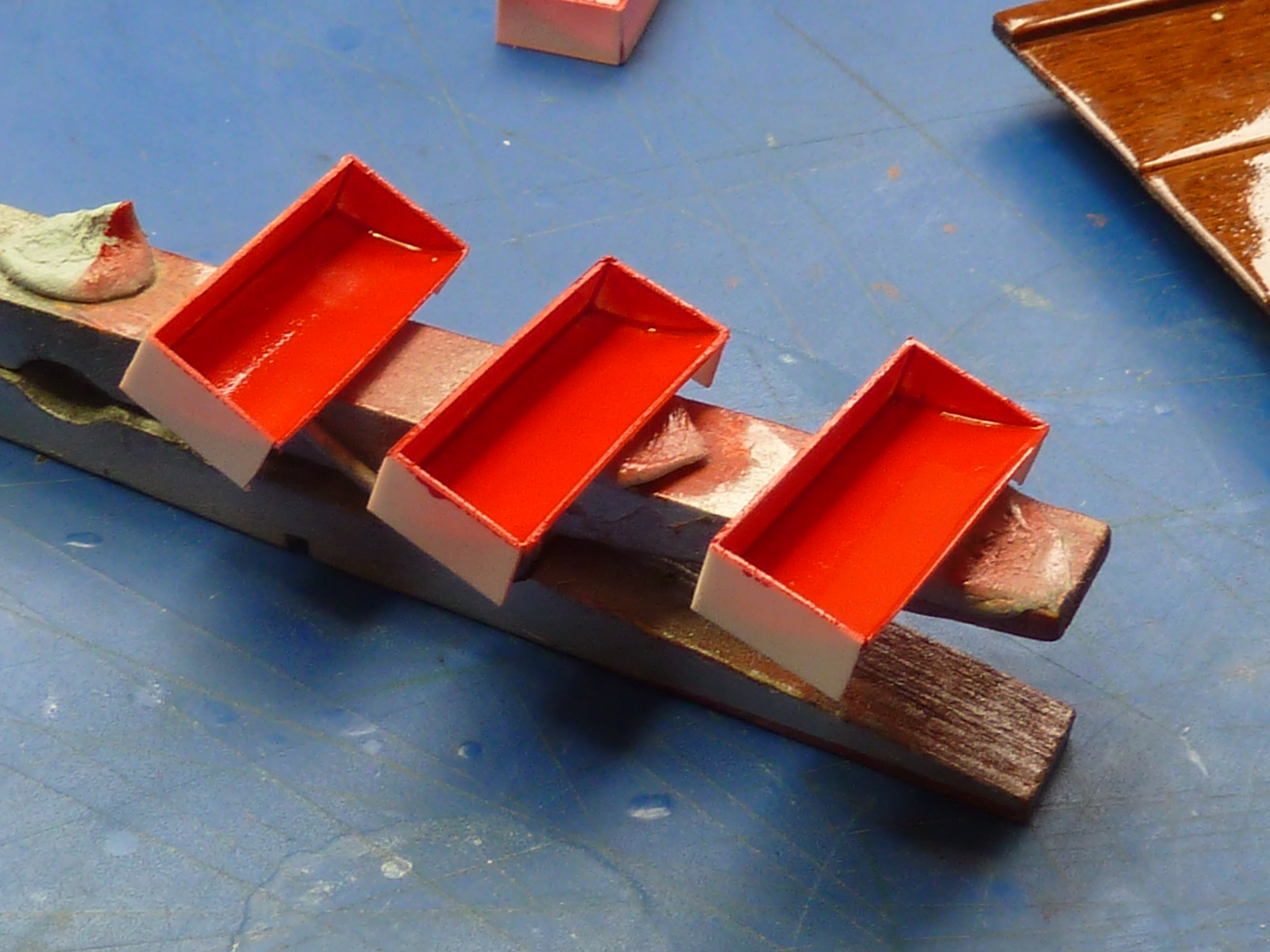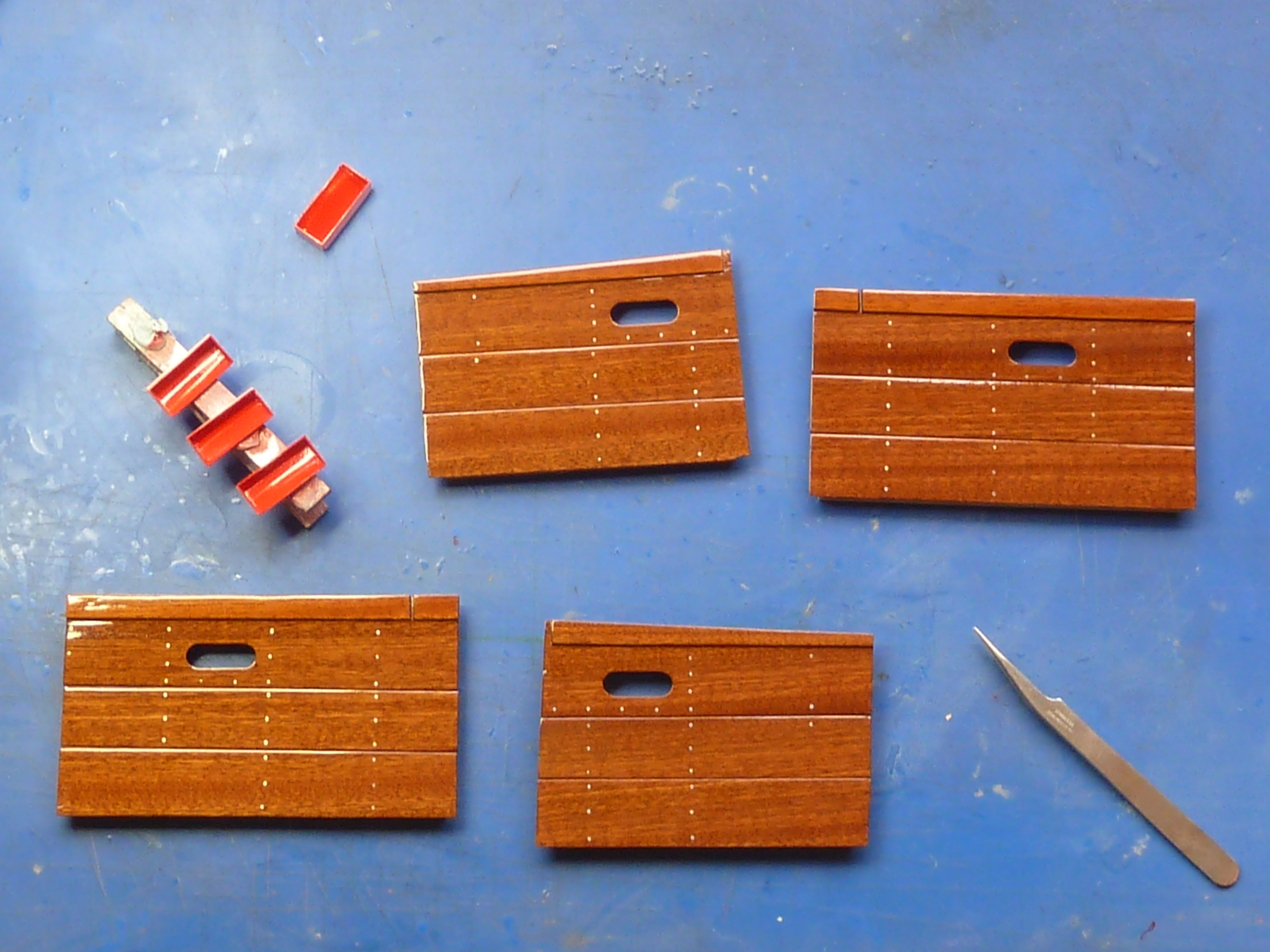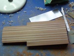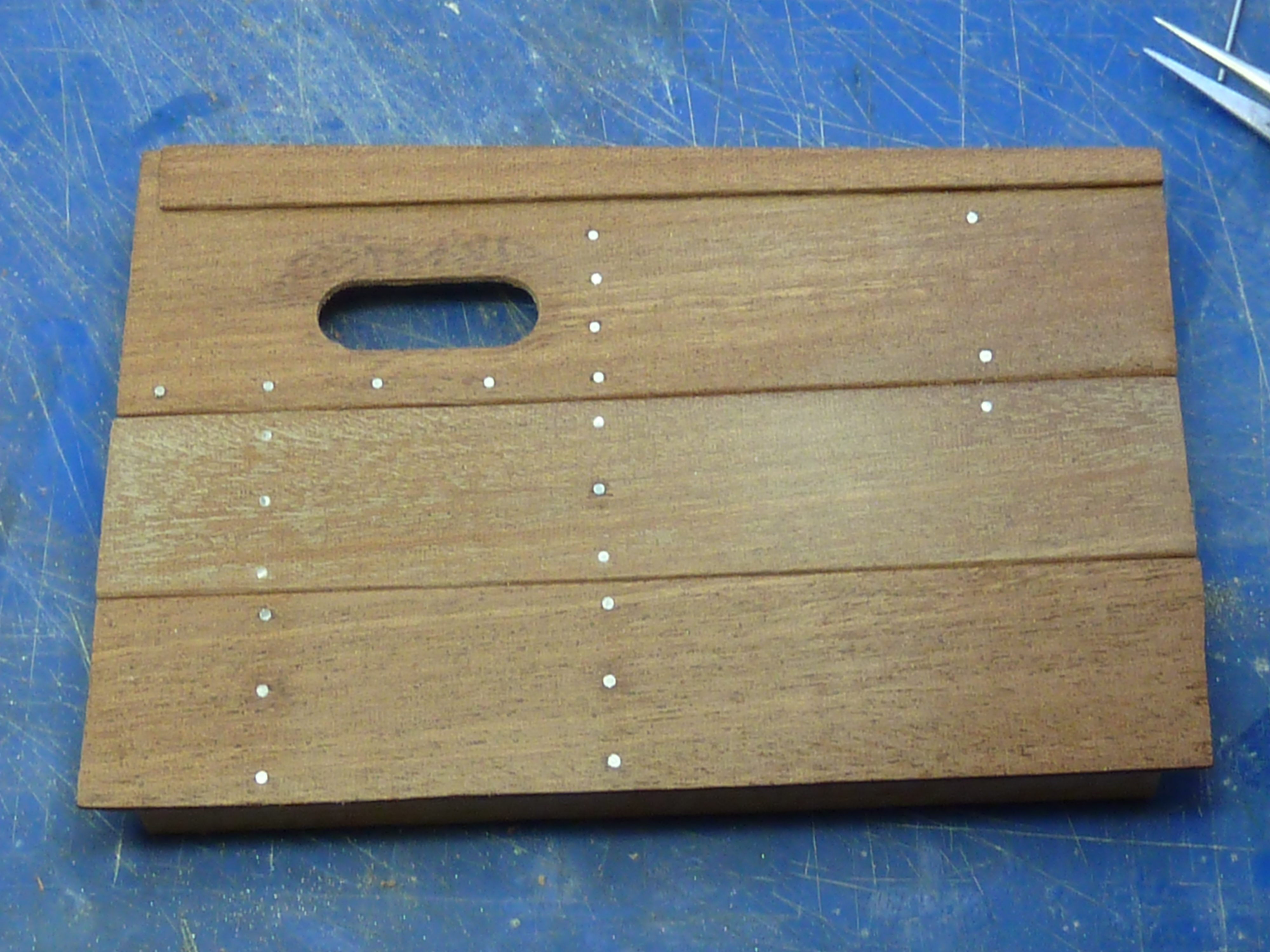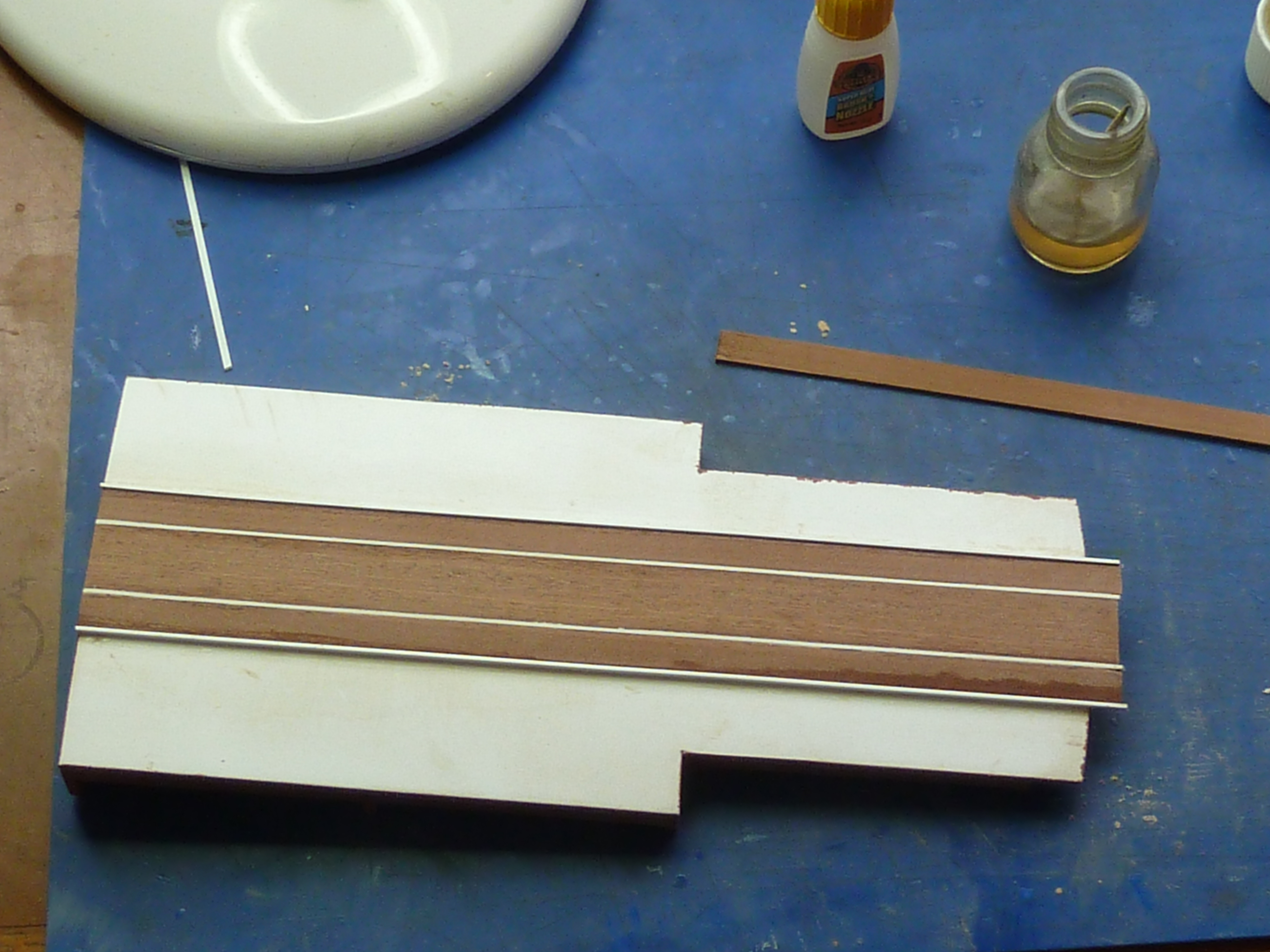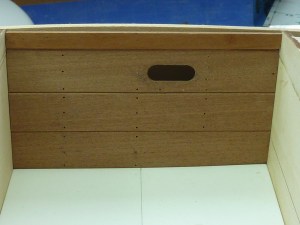 However, the top surface of the finished frame is covered with more sheet PVC and this has to be attached off the model. Here’s the assembled cover with the first strips of mahogany planking in place.