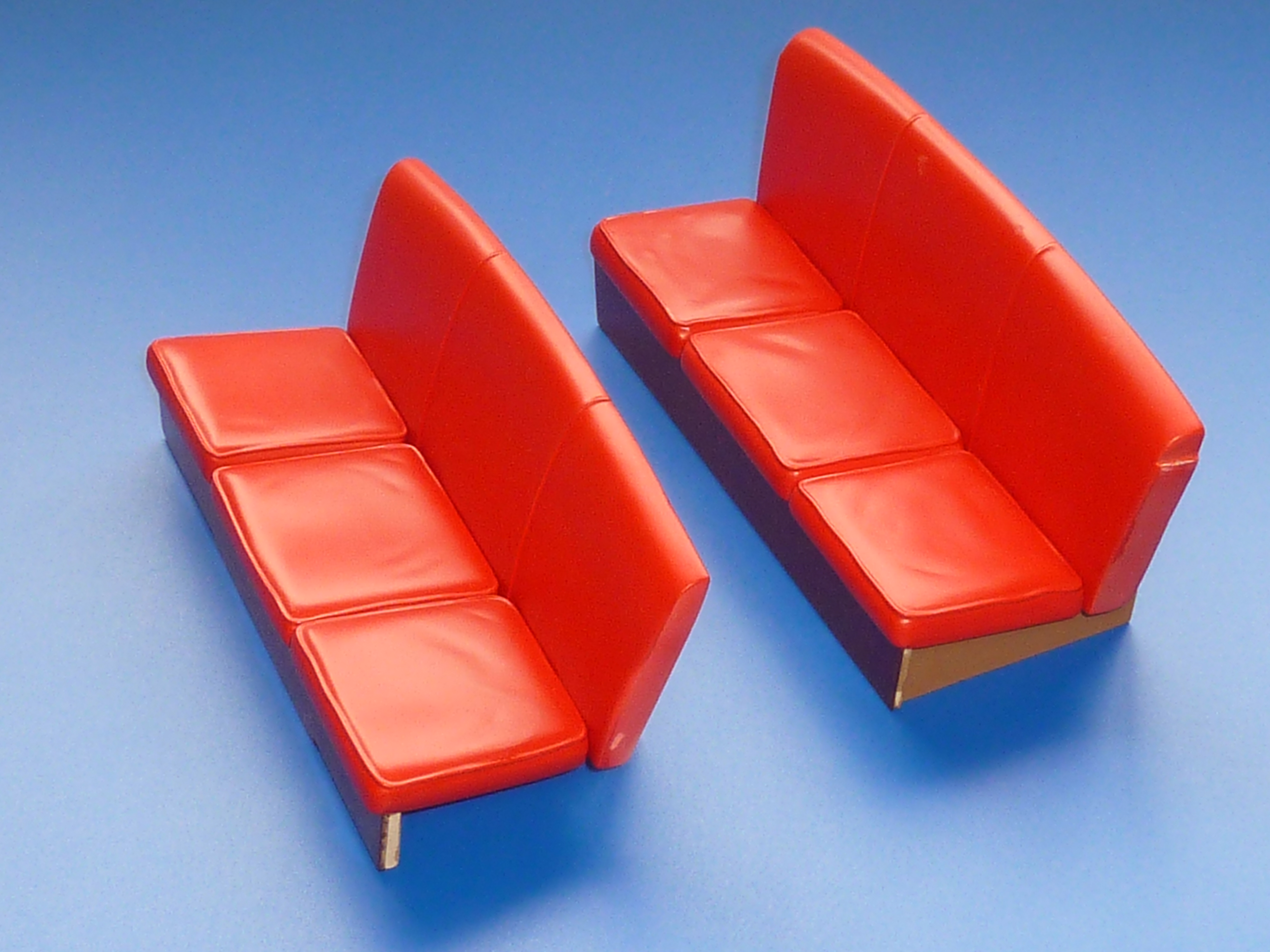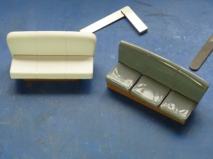 The whole affair was then sanded smooth (again), sealed with high build primer and an acylic gloss applied, simply because it gave a nice smooth finish for the final paint. A picture of one of the scratch built seats is shown below, next to the kit’s for comparison.