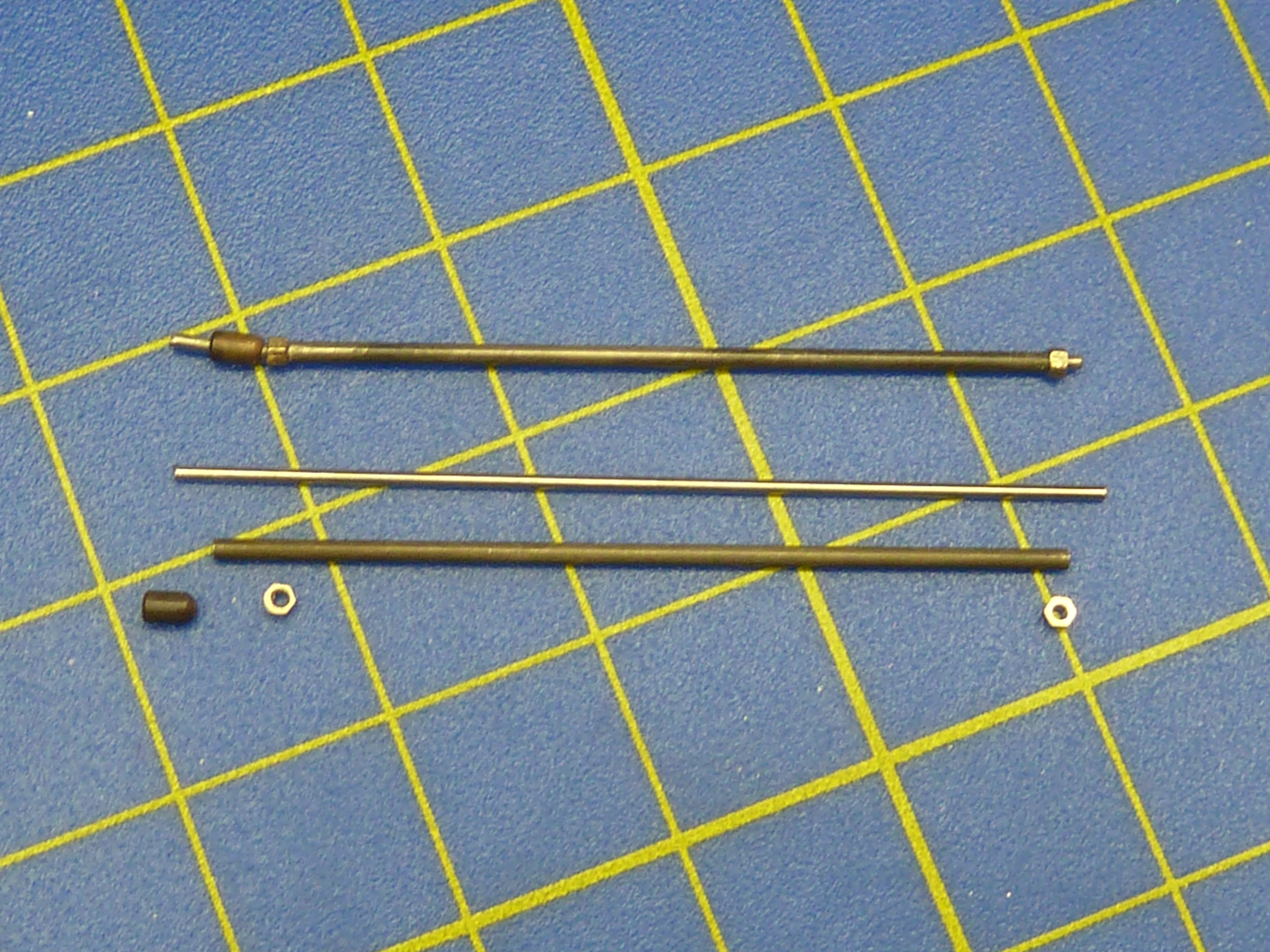 My rod is actually ccomprised of 5 parts. Some 0.7mm nickel silver rod, 1mm nickel silver tube, two tin plated M0.8 nuts drilled out, and a small piece made from 1.5mm brass tube. All the parts had, the by now ubiquitous, ageing applied to them.